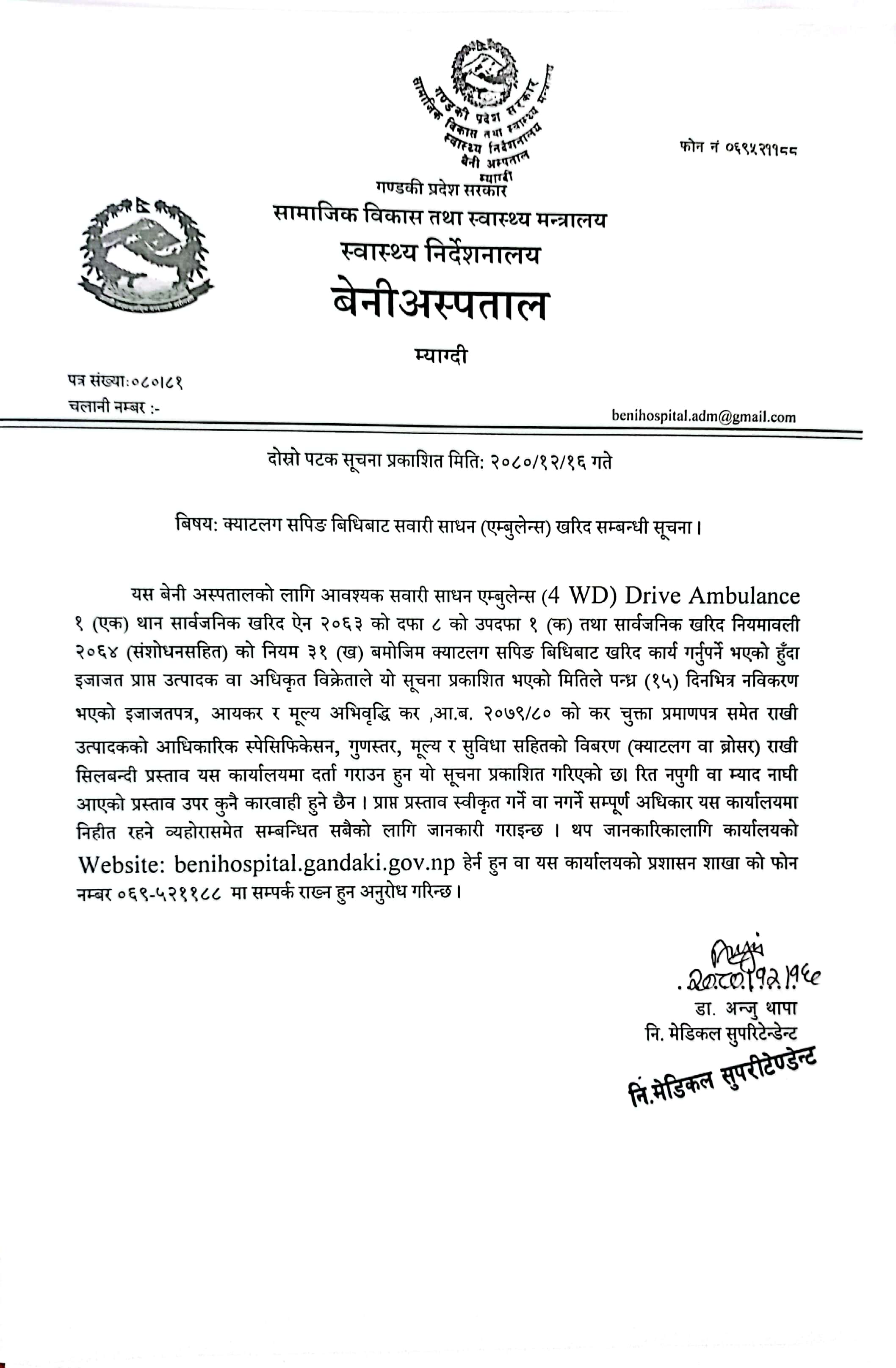 क्याटलग सपिङ्ग विधिबाट एम्बुलेन्स खरिद गर्ने सम्बन्धी बेनी अस्पताल म्याग्दीको सूचना